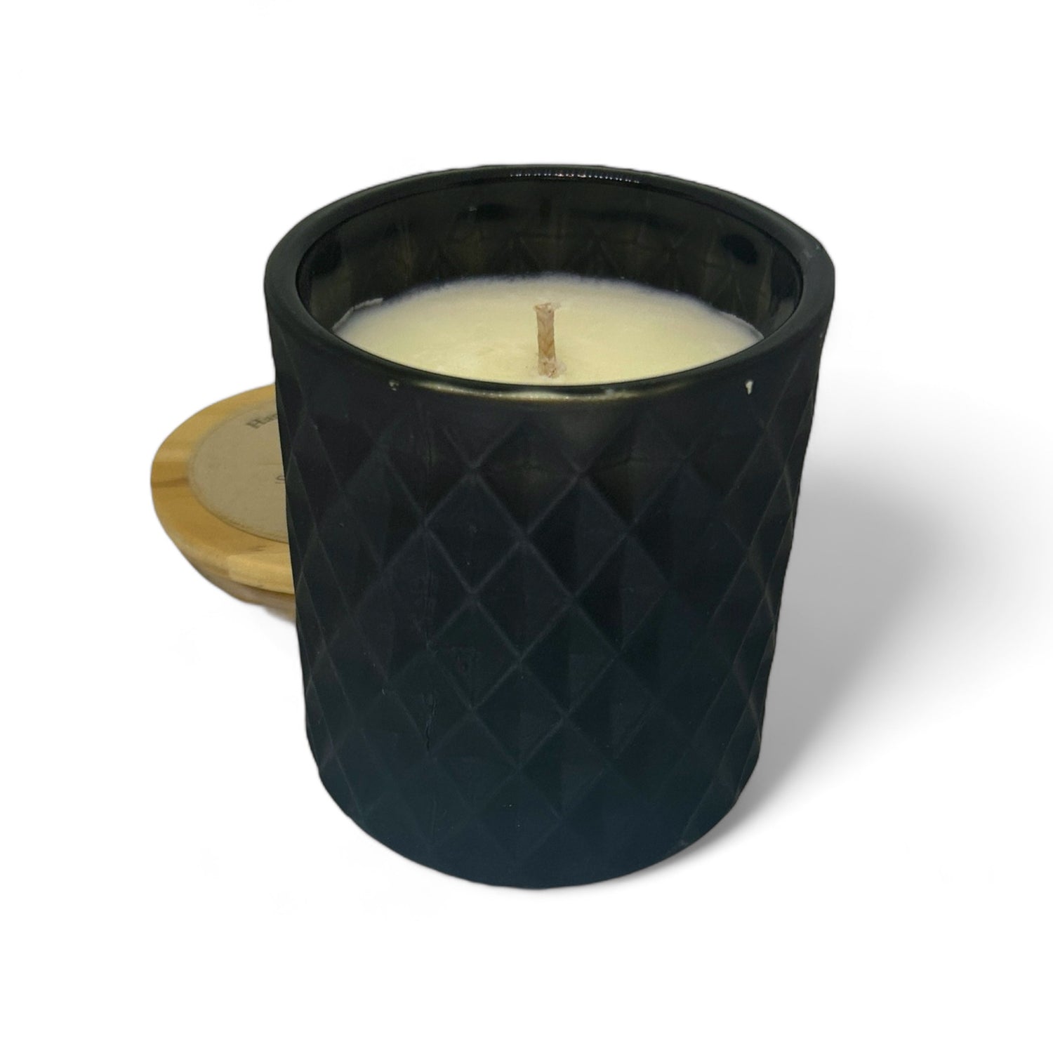 Housed in elegant matte black, geometric textured glass jars, these beautiful candles...